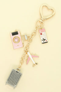 Product Description: Celebrate your wanderlust with this Travel Theme Bag Charm Keychain. Featuring an enamel heart clasp, boarding pass, crystal camera, airplane, and luggage trinket, this playful accessory adds personality to your bags or keys while sparking travel dreams.