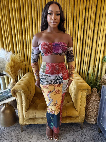 Bring vibrant energy to your wardrobe with the Wild Muse Two Piece Set — a bold fusion of color, pattern, and confidence. This patchwork-inspired ensemble features a fitted bandeau top with detachable long sleeves, perfectly paired with a high-waist maxi skirt that accentuates your curves. Showcasing a lively mix of animal, floral, and artistic prints in warm earthy tones, this set captures effortless boho-chic style. Ideal for vacation dinners, rooftop nights, or any occasion where you’re ready to turn heads.