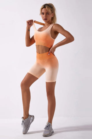 Product Description: Turn heads in this ombre seamless two-piece set, combining bold gradient style with comfort-driven design. The sleeveless crop top offers a sleek, supportive fit, while the matching high-waisted biker shorts provide a flattering, sculpted silhouette. Made from a stretchy, breathable nylon-spandex blend, this set moves effortlessly with your body—ideal for workouts, yoga, or casual days on the go. The seamless construction enhances comfort and creates a smooth, second-skin feel. Stylish and functional, it’s your new go-to for activewear with attitude.