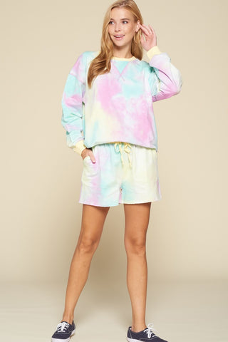 Introducing our Tie-dye Printed Jersey Top, a vibrant and comfortable addition to your wardrobe, available in sizes S, M, and L. This top features a lively tie-dye print, a round neckline, long sleeves, contrast rib hem details, and a triangle reverse coverstitch detail for a trendy and laid-back look.