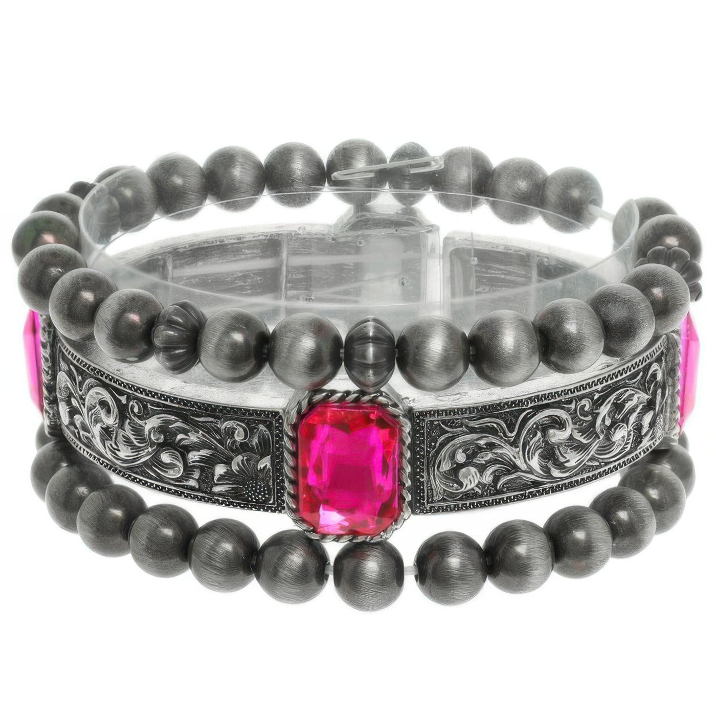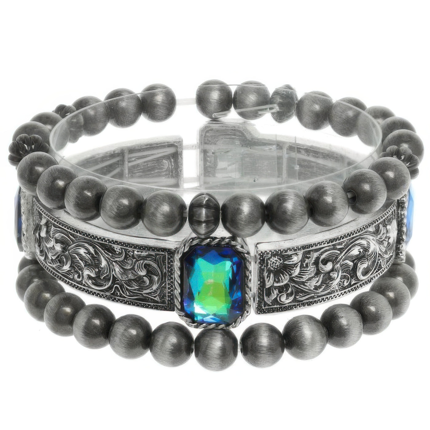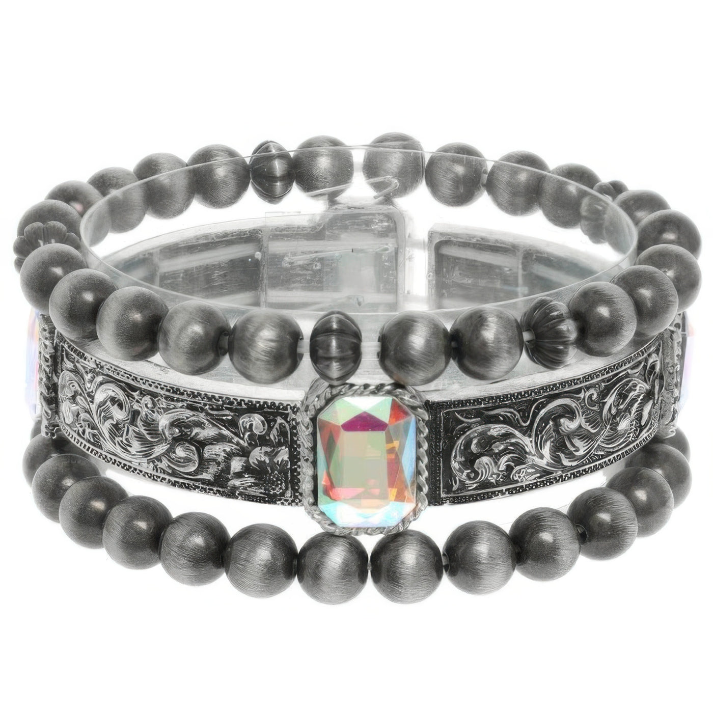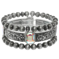 Product Description: Stack up the sparkle with this 3-piece Western crystal beaded bracelet set. Featuring two slim stretch bracelets and one bold centerpiece, this layered look combines shimmer and rustic charm. The faceted crystal beads reflect light beautifully, creating a festive yet wearable accent. Whether dressing up for a rodeo, concert, or festival, this versatile set adds instant glam to your wristwear collection.