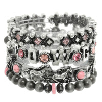 Product Description: Show off your wild west flair with this 4-piece Western Cowgirl Bracelet Set. Featuring beaded textures, turquoise crystals, and a bold “Cowgirl” word charm, each strand adds personality and sparkle. Designed with stretch for a comfortable fit, these stackable bracelets are perfect for rodeos, country concerts, or everyday style with an edge.