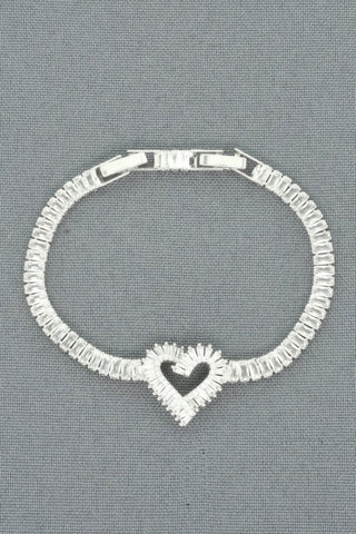 Product Description: Romantic and refined, this White Gold Plated CZ Heart Bracelet features dazzling baguette-cut stones with an open heart centerpiece that adds a graceful touch. Its polished, feminine design blends classic elegance with heartfelt charm, making it a standout piece for special occasions. With a secure clasp and lightweight build, it offers both beauty and ease of wear. Whether gifted to a loved one or worn for a night out, this bracelet makes a lasting impression. Ideal for brides, anniversaries, or meaningful moments.