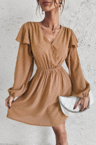 Swiss Dot Surplice Neck Ruffle Shoulder Midi Dress - Khaki / S