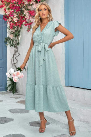 Product Description: Graceful and flattering, the Solid Deep V Dot Lace Belt Long Dress blends romantic detailing with effortless wear. Featuring a deep V neckline, delicate lace accents, and a coordinating waist belt, this dress is perfect for daytime events or vacation evenings. Its soft, stretchy fabric ensures comfort without compromising on style.