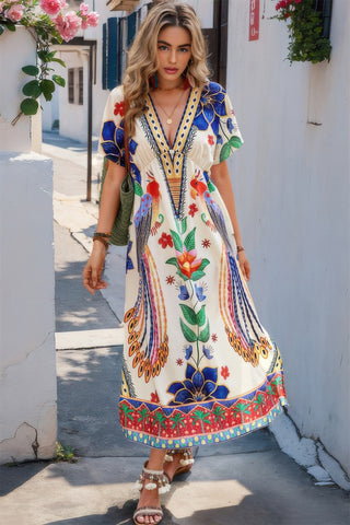 Product Description: Step into effortless elegance with this floral deep V-neck batwing sleeve dress, designed to flatter and flow with every movement. The soft, stretchy fabric hugs comfortably while the batwing sleeves add a touch of relaxed sophistication. A deep V-neckline enhances the feminine silhouette, while the allover floral print brings a fresh, vibrant charm to your wardrobe. Ideal for casual outings, vacations, or outdoor gatherings, this dress offers both style and comfort in equal measure. Pair it with your favorite sandals or heels for a versatile look that works for day or night.