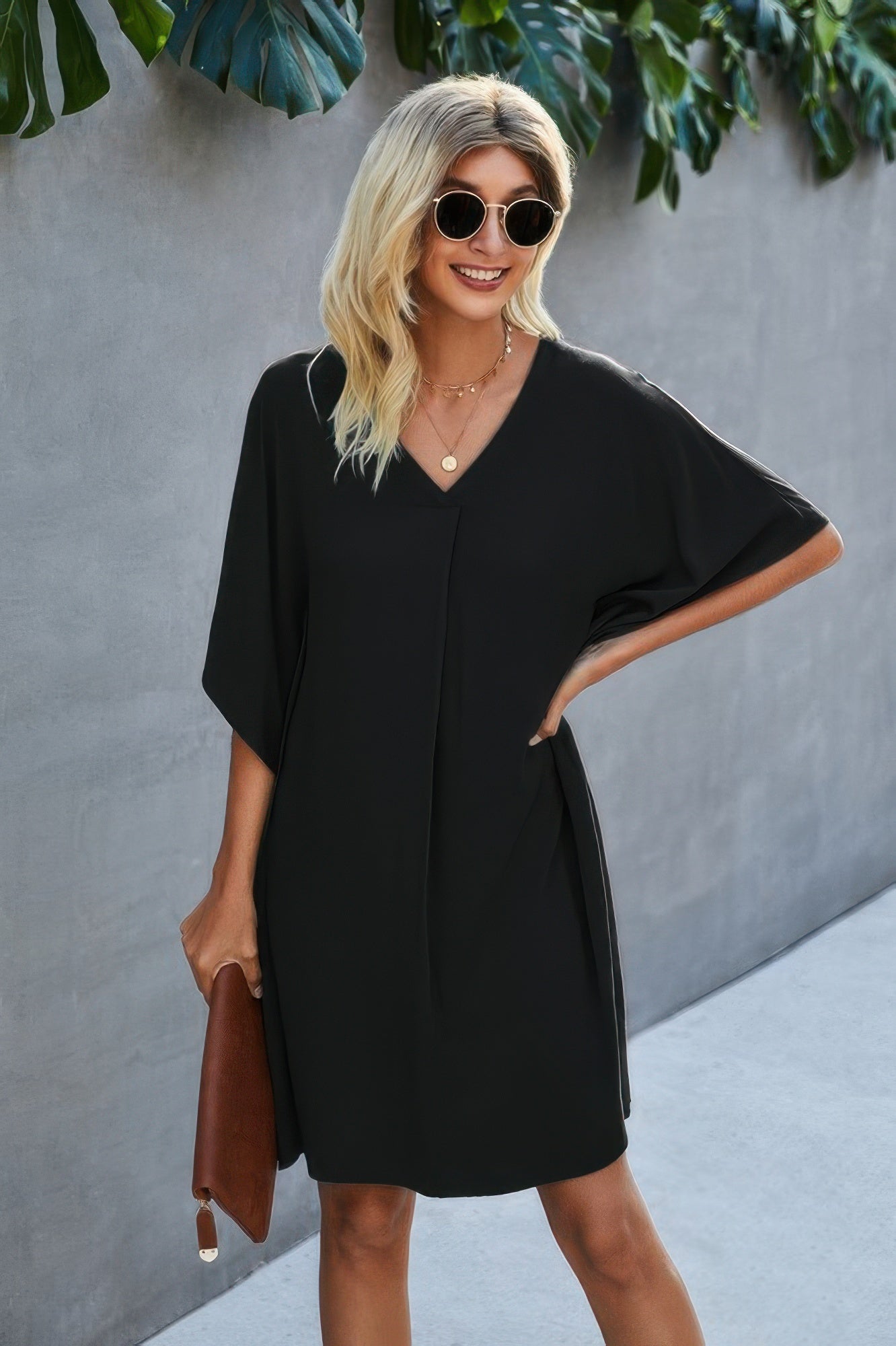 Product Description: The V Neck Solid Short Sleeve Dress is a versatile warm-weather essential. Made from breathable, lightweight rayon, it offers soft comfort with a breezy feel. The V neckline and relaxed silhouette provide a flattering fit that's easy to style. Perfect for vacations, casual days, or running errands, this short dress will quickly become a favorite in your rotation. Simple yet stylish, it works well with sandals or sneakers for an effortless look.