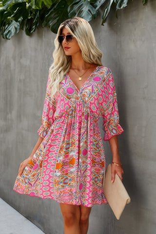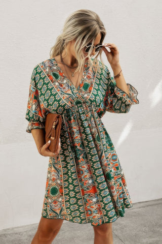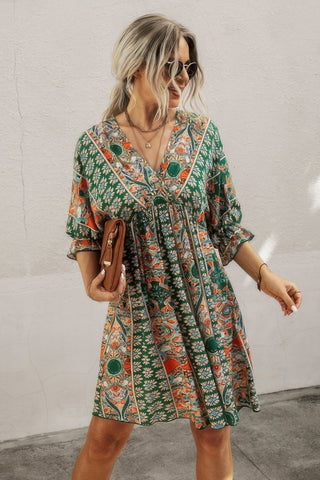 Features: V Neck, 1/2 Sleeve, Graphic Print, Low Back, Loose Fit, Swing, Ruffled, Short Dress, Casual