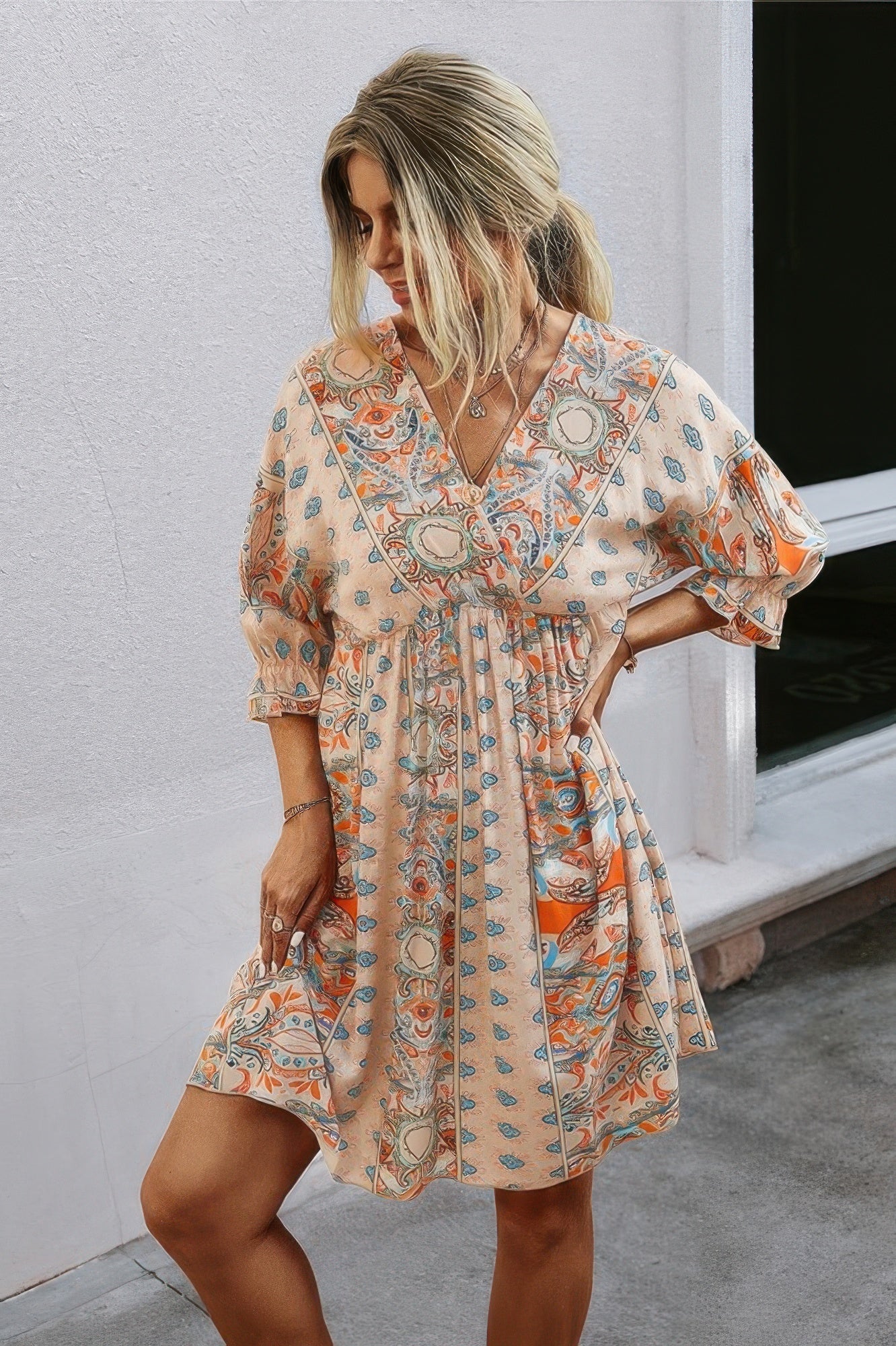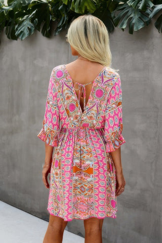 Product Description: The V Neck Half Sleeve Graphic Swing Dress is equal parts fun and effortless. Featuring bold graphic prints, soft half sleeves, and a relaxed swing shape, this dress is made for movement and comfort. A low back and ruffled hem add playful detail, making it perfect for warm days, festivals, or casual brunches. Lightweight and breathable, it’s a feel-good piece you’ll wear on repeat.