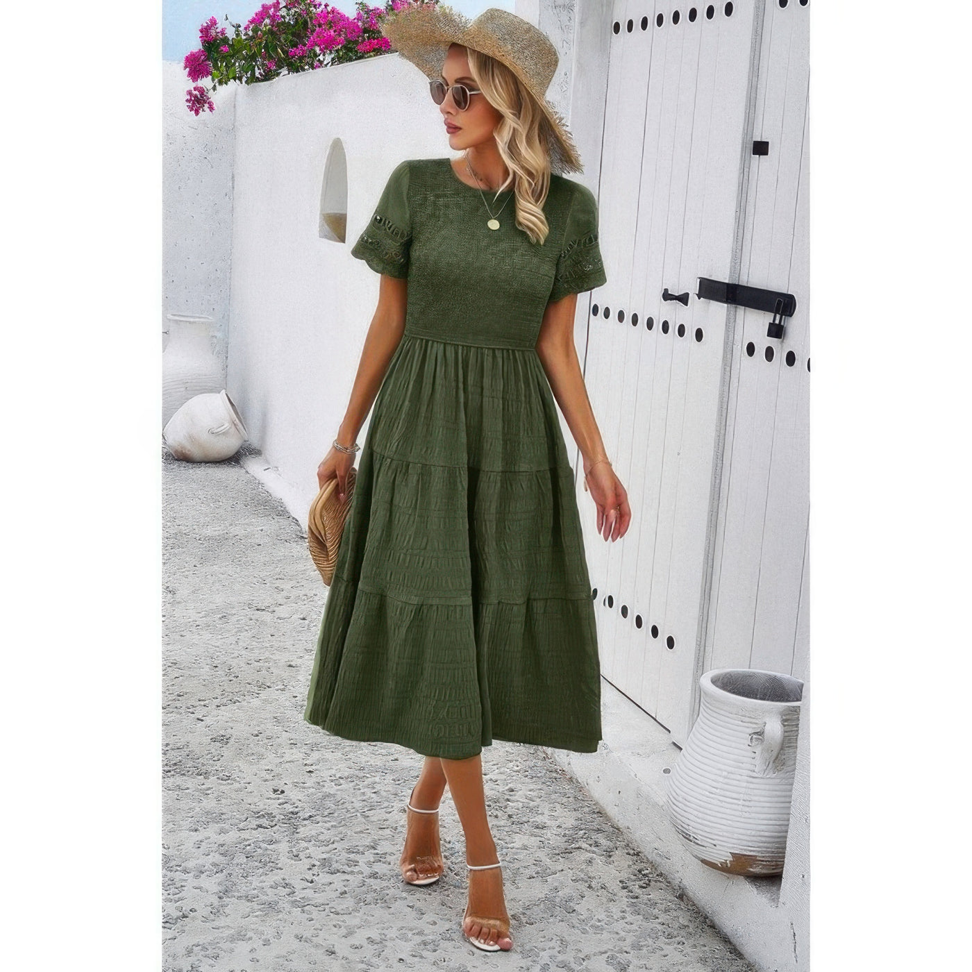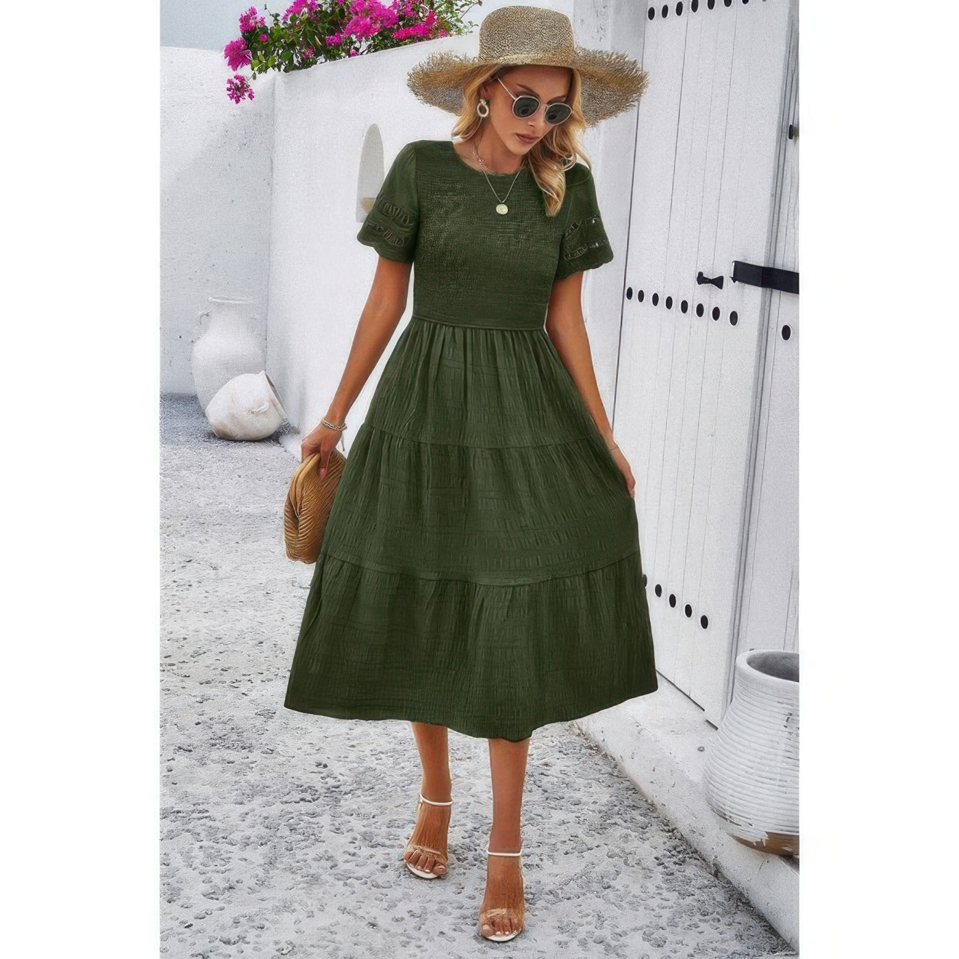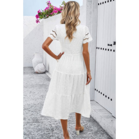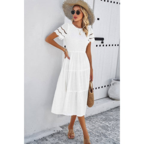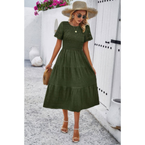 Lace Round Neck Ruched Fit Ruffle Solid Dress Sale
