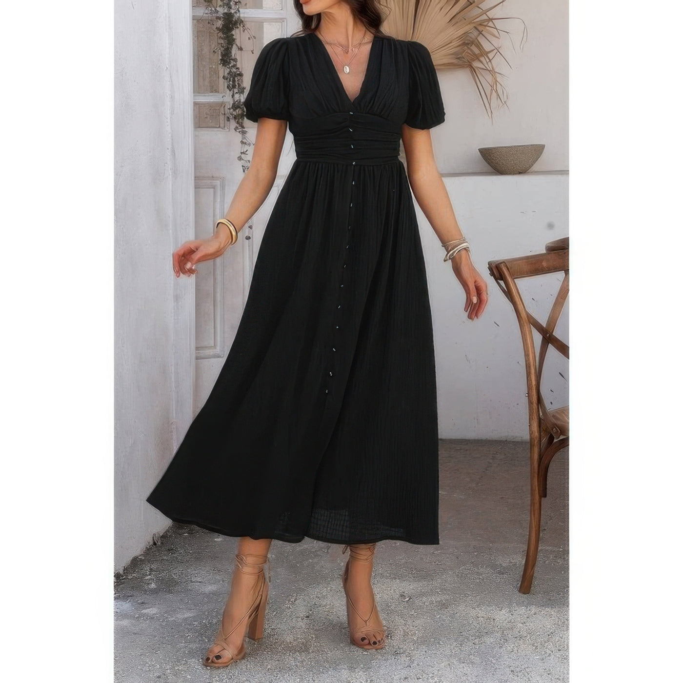 Solid V Neck Puff Sleeves Solid Knot Detail Dress - Black / S
