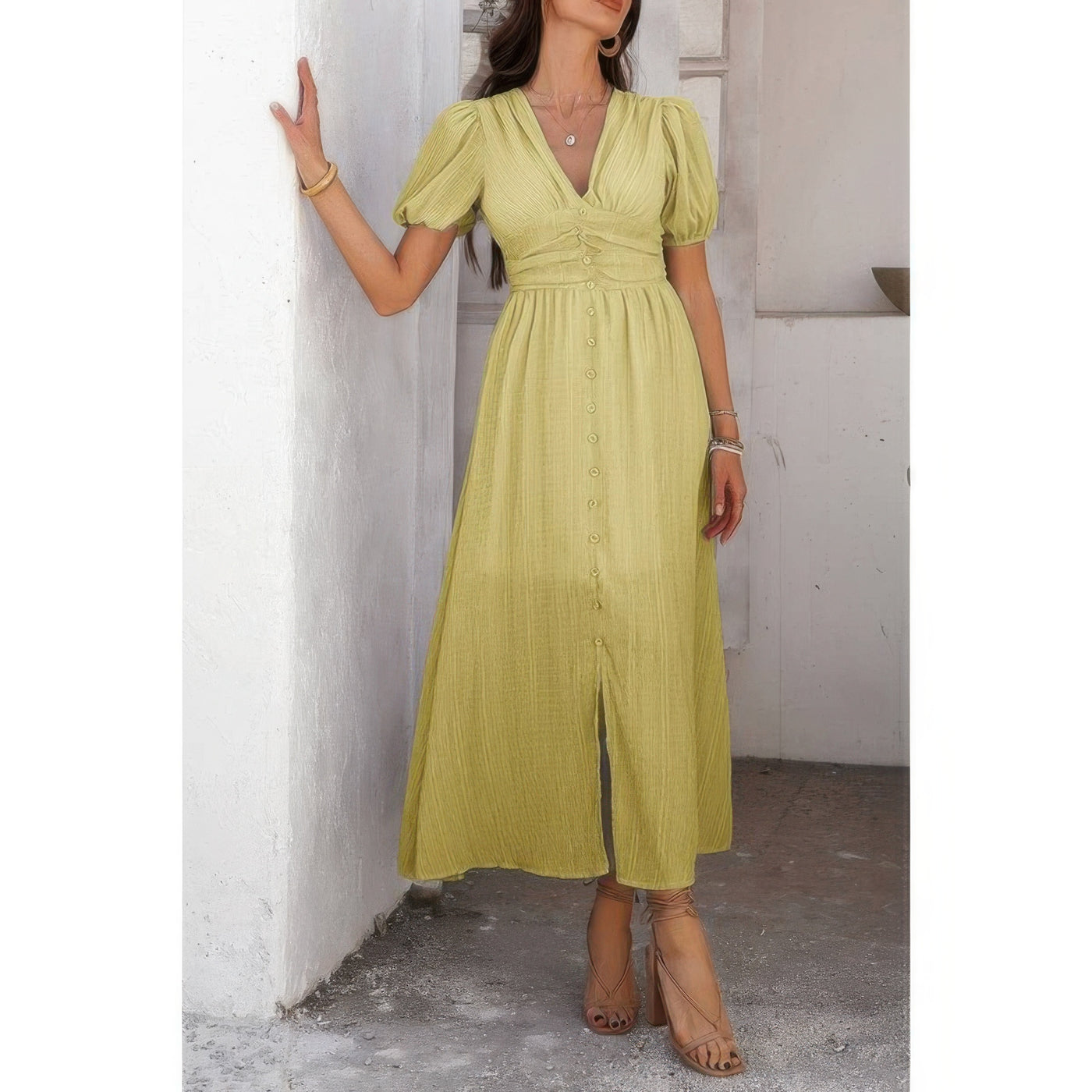 Solid V Neck Puff Sleeves Solid Knot Detail Dress Sale