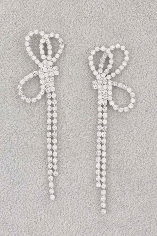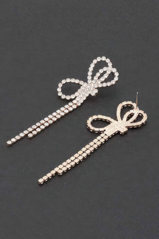 Product Description: Add glamour to your look with the Rhinestone Ribbon Earrings. These elegant drop earrings feature shimmering rhinestones shaped into graceful bow designs. Light-catching and feminine, they bring sophistication to any outfit, whether you're dressing up for a night out or adding sparkle to your everyday style.