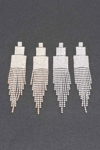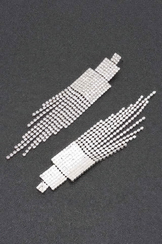 Product Description: Turn heads with the Radiant Elegance: Rhinestone Dazzle Earrings—a luxurious statement piece that captures light and attention effortlessly. Measuring approximately 0.85" x 4.5", these elongated earrings are adorned with cascading rhinestones that create a dazzling effect with every movement. Their dramatic length and refined sparkle make them the perfect accessory for formal events, special occasions, or a bold night-out look. Lightweight yet impactful, these earrings bring high-glamour energy while remaining comfortable to wear all evening long.