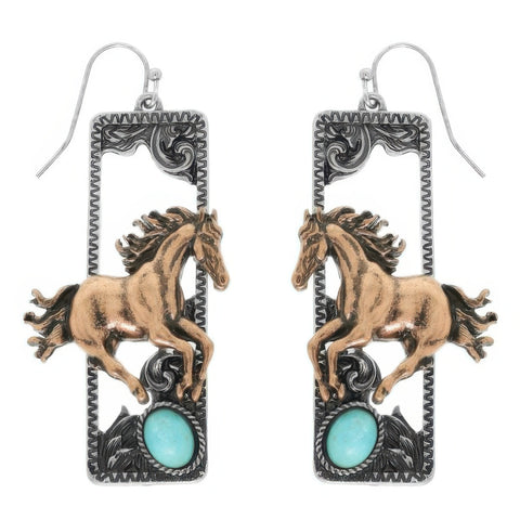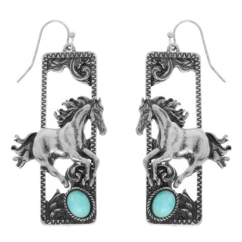 Product Description: Gallop into bold western style with these Wild Horse Dangle Earrings. Featuring turquoise accents and crafted in oxidized-toned metal, these earrings blend spirit and symbolism. Perfect for rodeos, country fairs, or casual looks with flair, they’re a standout addition to your cowgirl-inspired collection.