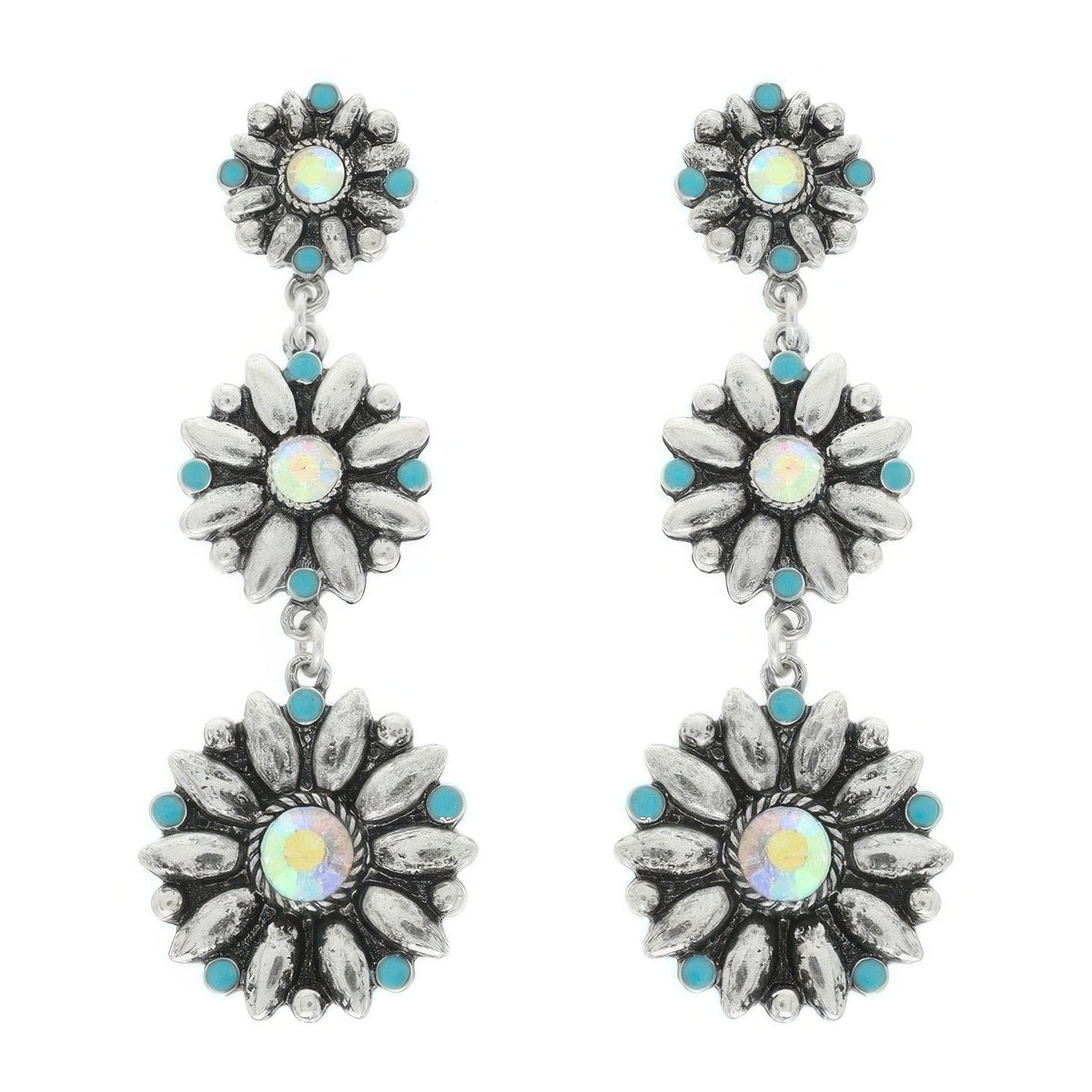 Product Description: Celebrate western style with these Floral Concho Linear Earrings. Embellished with turquoise crystals and floral motifs, these oxidized silver-tone earrings offer a bold yet feminine statement. Perfect for cowgirls, rodeo fans, and festivalgoers, they bring color, texture, and personality to any ensemble. Lightweight and full of movement, they’re a standout accessory for everyday charm or event-ready styling.