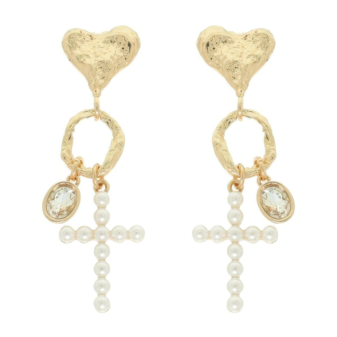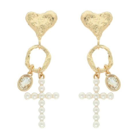 Jeweled Cross Heart Charm Earrings - Gold