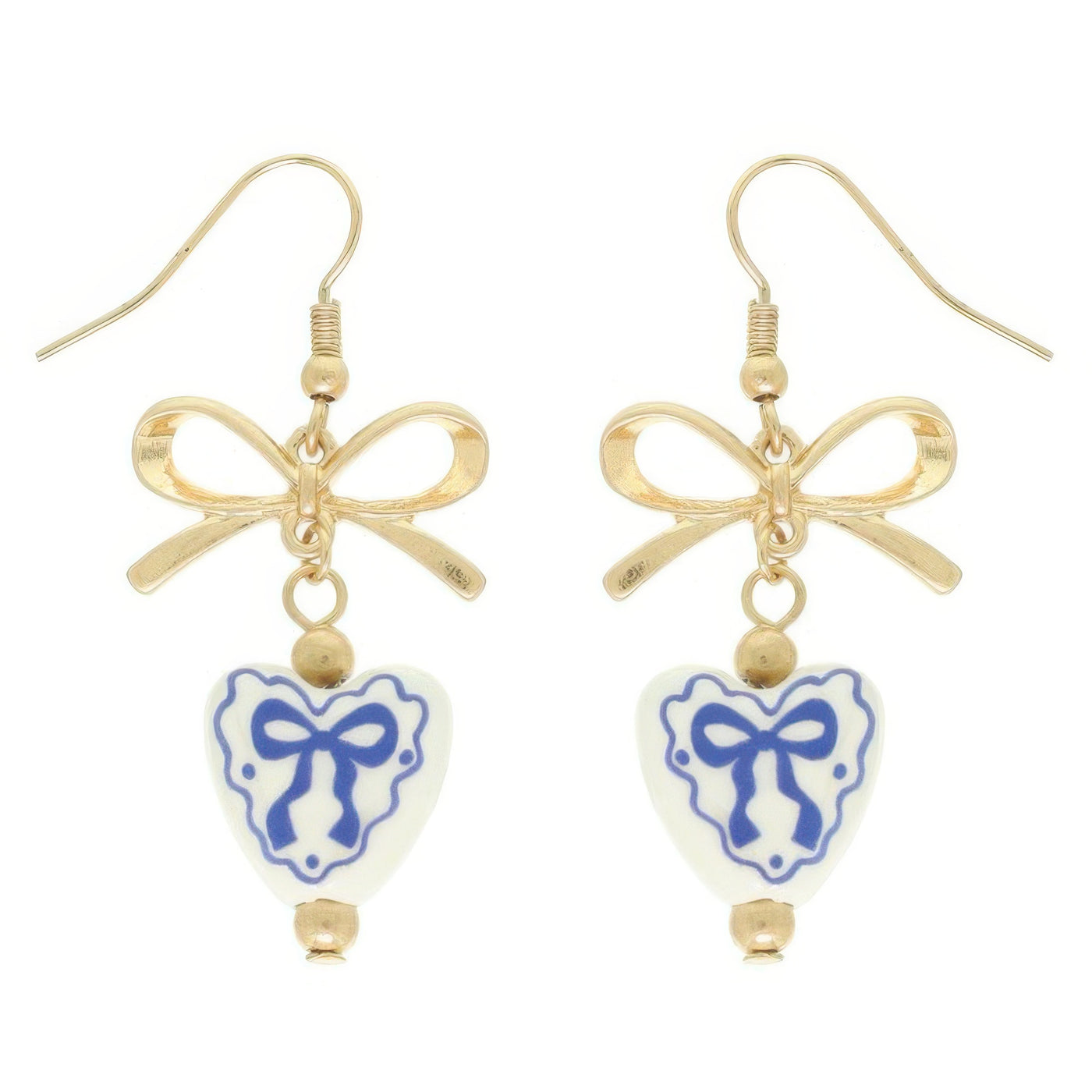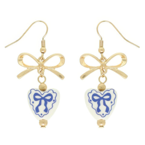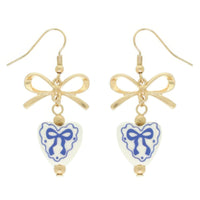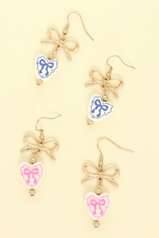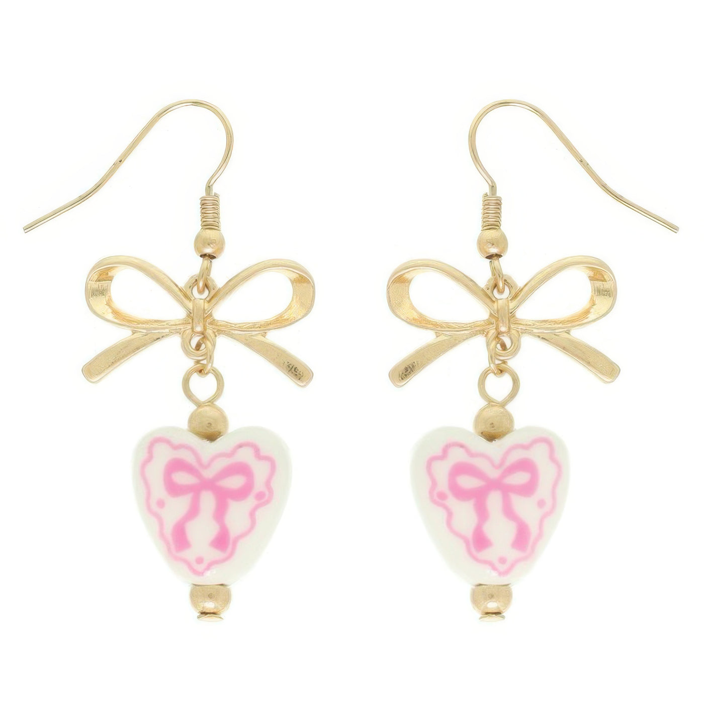 Ceramic Heart Charm Bow Earrings - Pink.Gpk