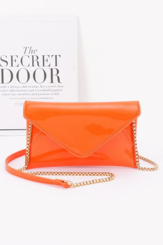 Product Description: The Azure Elegance Clutch is a refined statement piece that brings sophistication and shine to any look. Crafted from sleek enamel-finished polyurethane and detailed with mixed metal hardware, this envelope-style clutch offers a polished silhouette in a compact design. Measuring 8 inches wide, 5 inches high, and 0.5 inches deep, it's ideal for carrying your essentials without adding bulk. The chic chain strap allows for versatile styling, whether worn over the shoulder or carried as a clutch. Perfect for evenings out, special occasions, or when your outfit calls for a sleek finishing touch.