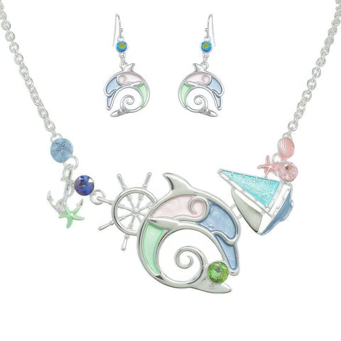 Product Description: Capture the spirit of the sea with this dolphin-themed bib necklace and earring set. Featuring playful dolphins, starfish, and seashells, this set is adorned with iridescent enamel and rhinestones for a brilliant marine glow. The silver-tone bib necklace offers a generous 2" drop, while matching earrings complete the beach-ready look. A whimsical, oceanic accessory perfect for summer events, vacations, or nautical-themed parties.