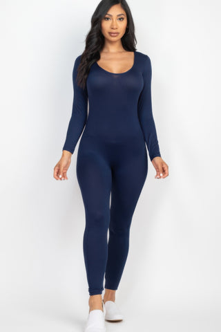 Scoop Neck Long Sleeve Bodycon Jumpsuit - Black / S