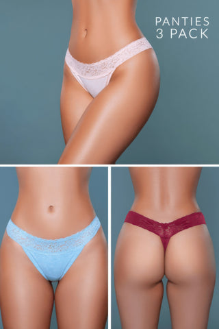 Product Description: Experience all-day ease with a hint of romance in the Asher Thong 3-Pack. Crafted from soft jersey with a touch of stretch, these thongs provide a flattering low-rise fit and a smooth feel against the skin. Each pair features a delicate floral lace design that adds a refined, feminine touch to your everyday essentials. The thong cut ensures minimal lines under clothing, while the cotton gusset enhances breathability and comfort. With three unique colors in each set, the Asher pack brings effortless style to your lingerie drawer.