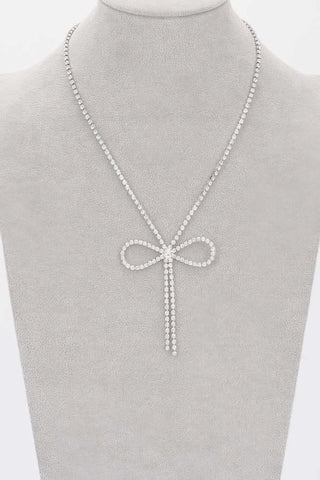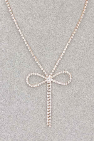 Product Description: Refined and radiant, the Rhinestone Ribbon Necklace brings a delicate sparkle to any ensemble. Featuring an elegant bow design, this necklace is adorned with shimmering rhinestones that catch the light beautifully. Its graceful silhouette rests comfortably at the collarbone, offering a sophisticated finish that's perfect for both everyday elegance and special occasions. Whether paired with a formal gown or a chic blouse, this piece adds a feminine and polished touch. Designed to stand out with subtle charm, it's a timeless addition to your jewelry collection.