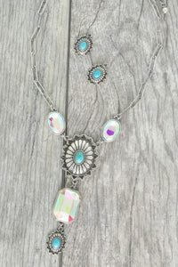 Product Description: Capture spiritual elegance with this Western Cross Gemstone Necklace and Earring Set. A striking cross pendant adorned with turquoise semi-stones and sparkling crystals rests on a long oxidized silver-tone chain. Matching dangle earrings complete this faith-inspired set, perfect for those who love a blend of tradition and statement style. Whether styled for worship, festivals, or everyday wear, this set offers a bold and meaningful accessory option.