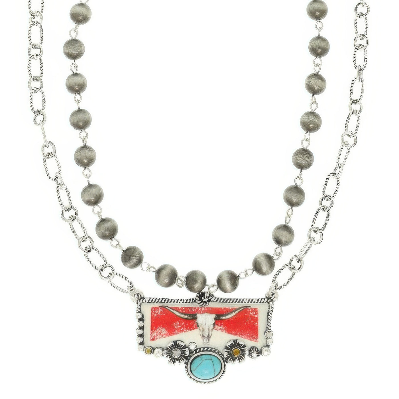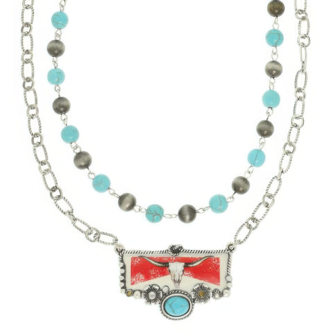 Product Description: This Western multi-strand necklace features a bold enamel steer head pendant accented in turquoise, delivering rustic flair with modern appeal. Designed to layer beautifully, the textured strands offer depth and movement, while the lightweight feel makes it easy to wear from day to night. Pair it with denim or dresses for effortless cowgirl style.