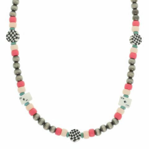 Product Description: The Western Theme Charm Beaded Necklace delivers playful style with a bold personality. This choker-length necklace features multi-colored turquoise beads, a checkered bead accent, and whimsical playing card charms. Its light, snug fit makes it comfortable for all-day wear, while the adjustable chain allows for perfect sizing. Perfect for themed events, festivals, or adding a pop of color to your everyday look, this piece blends retro casino flair with Western charm.