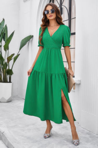 Product Description: Make a graceful statement in this solid V-neck dress, designed with ruched detailing and a high waist that flatters the figure. The puff sleeves add a touch of vintage-inspired charm, balancing structure with softness. Crafted from a smooth, stretchy blend of polyester and elastane, it offers a comfortable, flexible fit that moves with you. Ideal for a variety of occasions, this dress easily transitions from day to evening. Pair it with sandals or heels for an effortlessly put-together look.