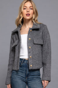 Stay warm and stylish with our Long Sleeve Teddy Fleece Short Jacket, a cozy addition to your wardrobe that’s perfect for chilly days. This button-down jacket features soft teddy fleece for ultimate comfort and a trendy look. Key Features: Fabric: Made from one hundred percent polyester for a plush, cozy feel Fit: Available in small, medium, and large, designed for a relaxed yet flattering silhouette Color Options: Available in Heather Charcoal Design: Features long sleeves and a button-down front, offering both warmth and style Versatile Styling: Perfect for layering over tees or sweaters, this jacket is ideal for casual outings or lounging