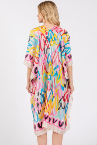 Multi Colored Heart Print Silky Feel Kimono - Beige