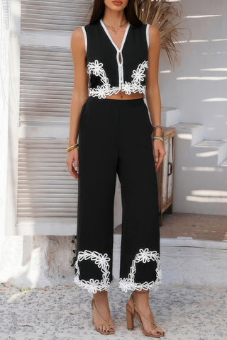 Product Description: Delicate details meet everyday comfort in this two-piece V-neck set featuring lace accents and button embellishments. Crafted from 100% viscose, it offers a lightweight, breathable feel with a soft, flowing drape. The top features a flattering V-neckline and button-front design, elevated by intricate lace decoration for a feminine finish. Paired with relaxed-fit long pants, this set brings together comfort and charm for effortless day-to-day style. Ideal for casual outings, vacations, or outdoor plans, it’s an easy way to look put-together with minimal effort.