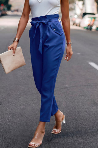 Product Description: Add refined detail to your wardrobe with these Ruffle Belt Pocket Solid Skinny Pants. Designed with a flattering high waist, removable belt, and subtle ruffle trim, they combine polish with comfort. Stretch fabric hugs your curves for a sleek and confident look.