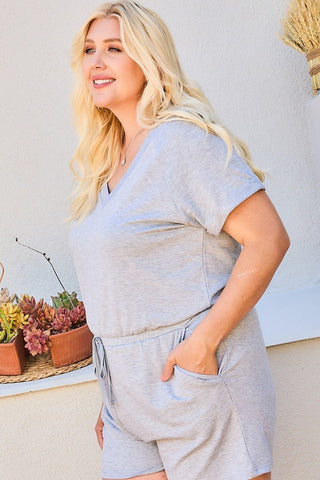 V Neck Short Raglan Sleeve Waist Elastic Band Side Pocket Solid French Terry Romper - 3XL