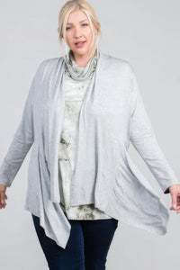 Upgrade your wardrobe with our Waist Seam Shark Bite Long Sleeve Open Solid Cardigan in Heather Grey. Add it to your cart now and experience the perfect blend of fashion and comfort!