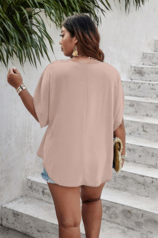 Product Description: Graceful and easy to wear, this plus-size lace V-neck blouse combines romantic detail with a breezy silhouette. The batwing short sleeves offer a relaxed fit and soft movement, while the delicate lace accents at the neckline elevate its feminine appeal. Made from 100% polyester, this lightweight top is ideal for staying cool and comfortable without compromising on style. Whether you're heading out for a casual day or enjoying an evening gathering, this blouse adds a touch of elegance to any outfit. Pair it with jeans or a skirt for a polished, everyday look.