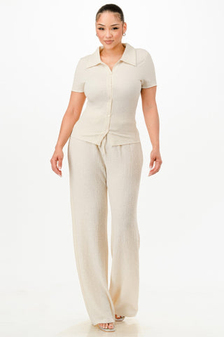 Add a touch of elegance to your wardrobe with our Textured Polo Top and Pants Set. Made from bubble crepe fabric, this set offers a unique textured look while providing all-day comfort and style. Perfect for both casual outings and more refined events, this set will quickly become a favorite.