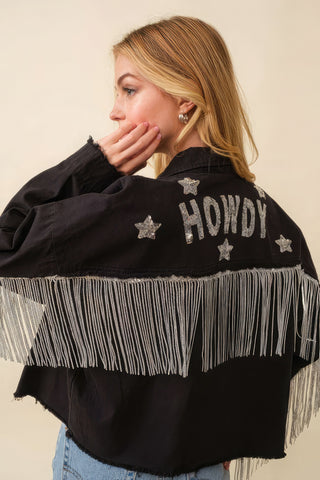 Saddle up and make a statement with our Howdy Sequin Fringe and Star Patches Jacket in Black. Add it to your cart now and let your Western spirit shine!