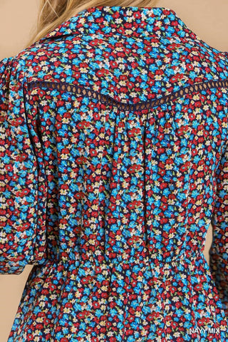 Add the Collared Neckline Button Down Floral Print Dress with Crochet Trimmed Details in navy to your cart now and embrace the perfect blend of comfort, style, and feminine charm!