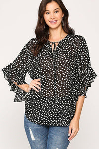 Introducing our Leopard Printed Crepe Top, available in sizes S, M, and L. This stylish top features a tying V-neckline, ruffled sleeves, and a rounded hemline, creating a chic and on-trend look. Crafted from 100% Polyester, the Black color adds a touch of sophistication to this fashionable piece.