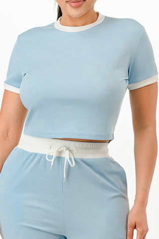 Product Description: This ribbed contrast binding top and pants set delivers an effortlessly cool look with everyday versatility. The cropped top features bold contrast trim that adds a sporty edge, while the soft ribbed fabric offers a close, flattering fit. Coordinating drawstring pants complete the look with a relaxed feel and functional pockets for added ease. Available in five standout color options, this set balances comfort and style, making it a go-to for casual days, travel, or lounging in style.