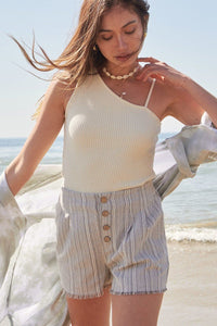 Elevate your casual style with our "A Pair Of Striped Woven Shorts," available in sizes S, M, and L. These shorts feature an exposed button closure, pleated front, side seam pockets, frayed raw-edge hem, elastic waist, and a relaxed fit for a laid-back and trendy look.