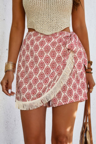 Product Description: Brighten up your warm-weather wardrobe with these All Over Print Asymmetric Hem Tassel Shorts. Featuring a lively allover pattern and playful tassel details, these shorts bring a fun, free-spirited vibe. The soft fabric blend offers stretch and breathability, making them perfect for sunny days. Pair with a tank or tee for easy summer styling.