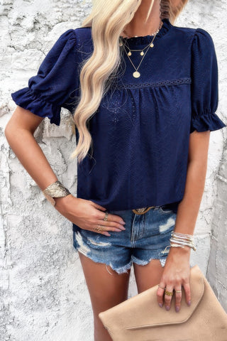 Round Neck Embroidery Ruffle Sleeve Loose Fit Shirt