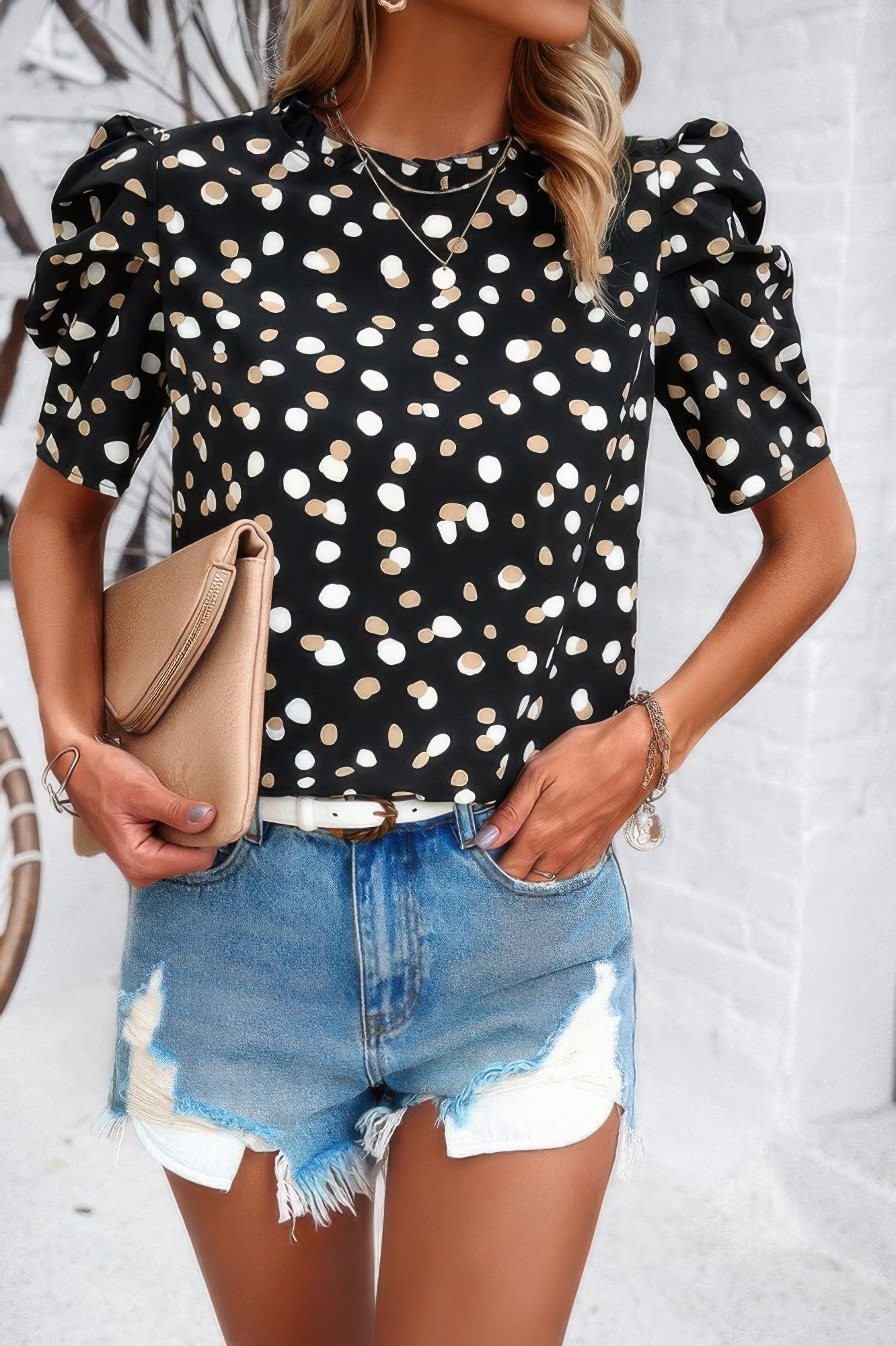 Puff Sleeves Allover Print Knot Loose Fit Top - Black / S