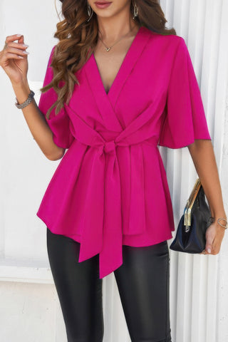 V Neck Peplum Tie Front Short Bell Sleeve Shirt Sale