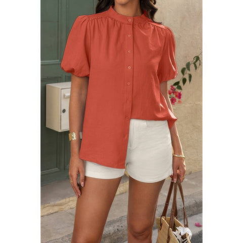 Product Description: Elevate your everyday look with this Button Down Lantern Puff Short Sleeve V-Neck Top, designed for effortless charm and all-day comfort. The V-neckline adds a flattering touch, while the lantern-style puff sleeves create soft volume and feminine appeal. A full button-down front offers classic structure, complemented by the lightweight, breathable feel of 100% polyester fabric. Whether you're heading to brunch, a casual outing, or enjoying a vacation day, this top delivers easy polish with a relaxed, flattering fit.