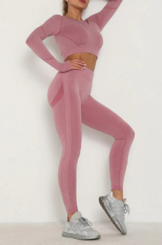 Product Description: Elevate your activewear collection with this seamless top and leggings set, designed for both performance and style. The space dye crop top features a round neckline, long sleeves, and built-in thumb holes for added comfort and support. Paired with high-waisted, full-length leggings, this set offers a sleek, body-hugging fit that stretches with every move. Crafted from a breathable, moisture-wicking blend of nylon and spandex, it delivers comfort whether you're working out or winding down. With its seamless construction and athletic silhouette, this set is made to move with you.